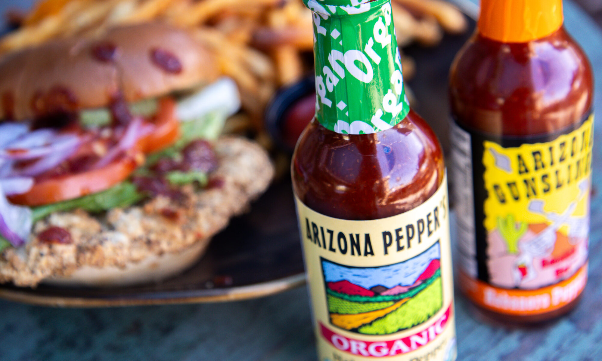 Bottles of Arizona Pepper Products hot sauce displayed on a rustic table