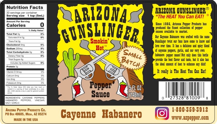 Cayenne habanero hot sauce fans enjoy its lively classic style. And our AZ Gunslinger version brings quick sharpness from cayenne with fruity depth from habanero.